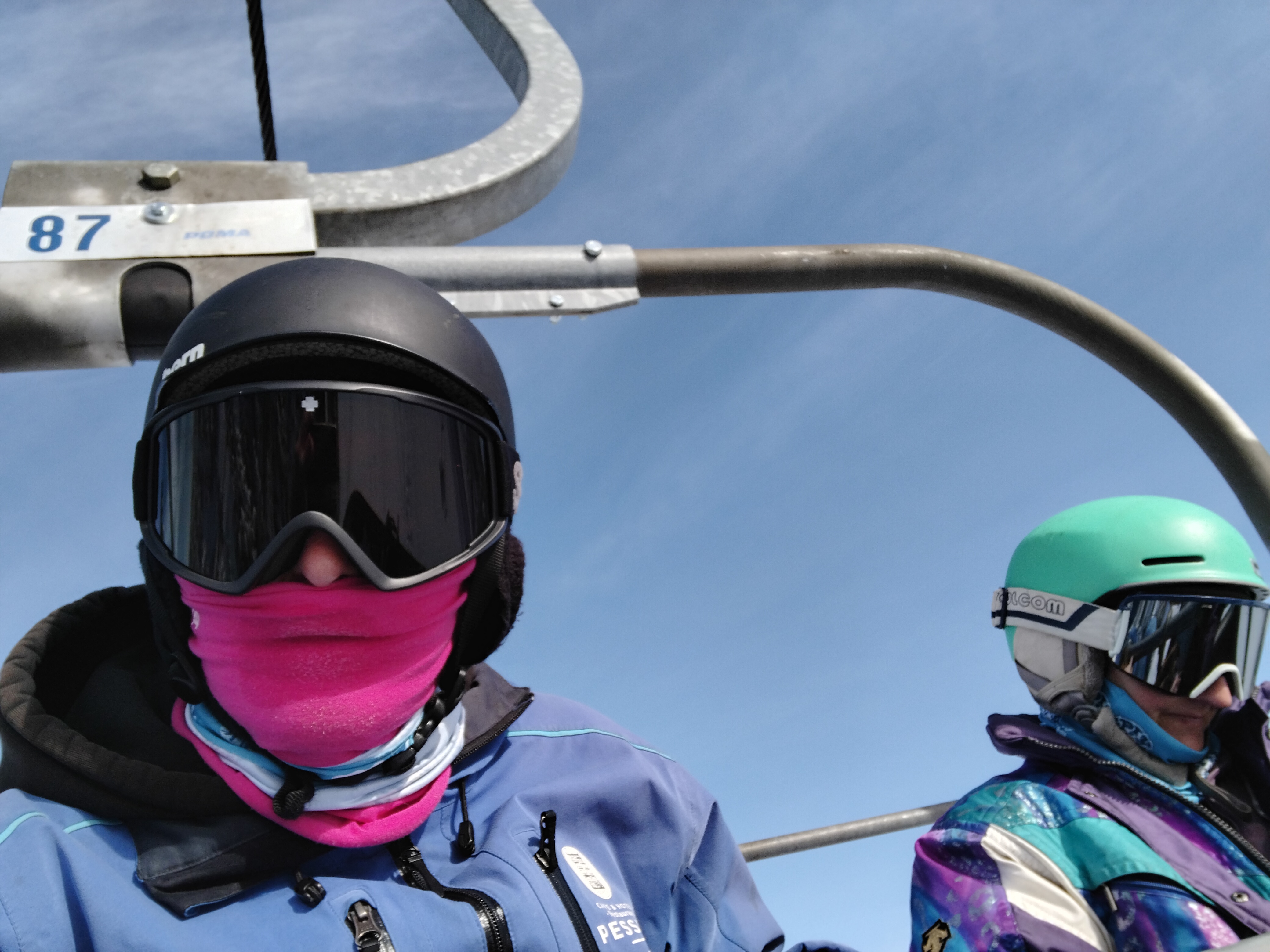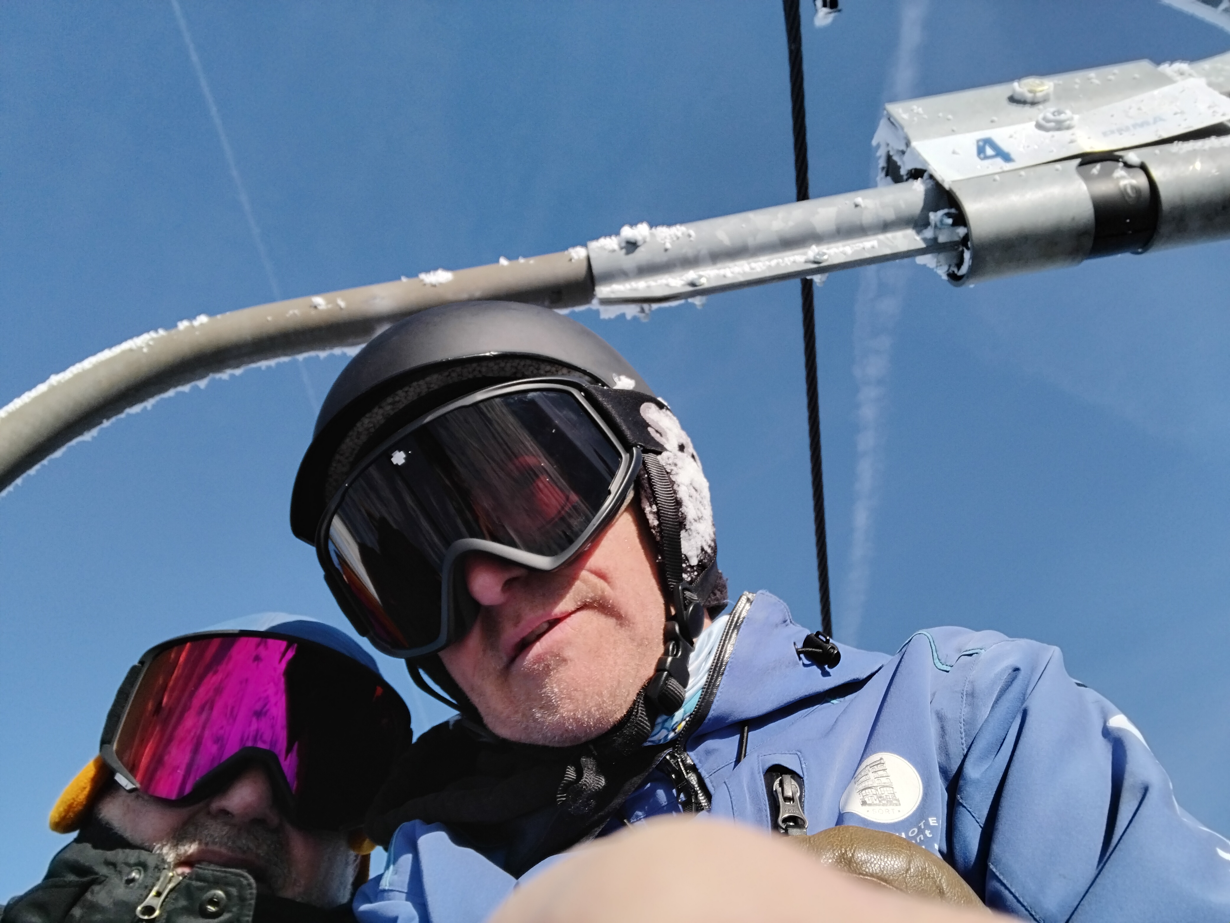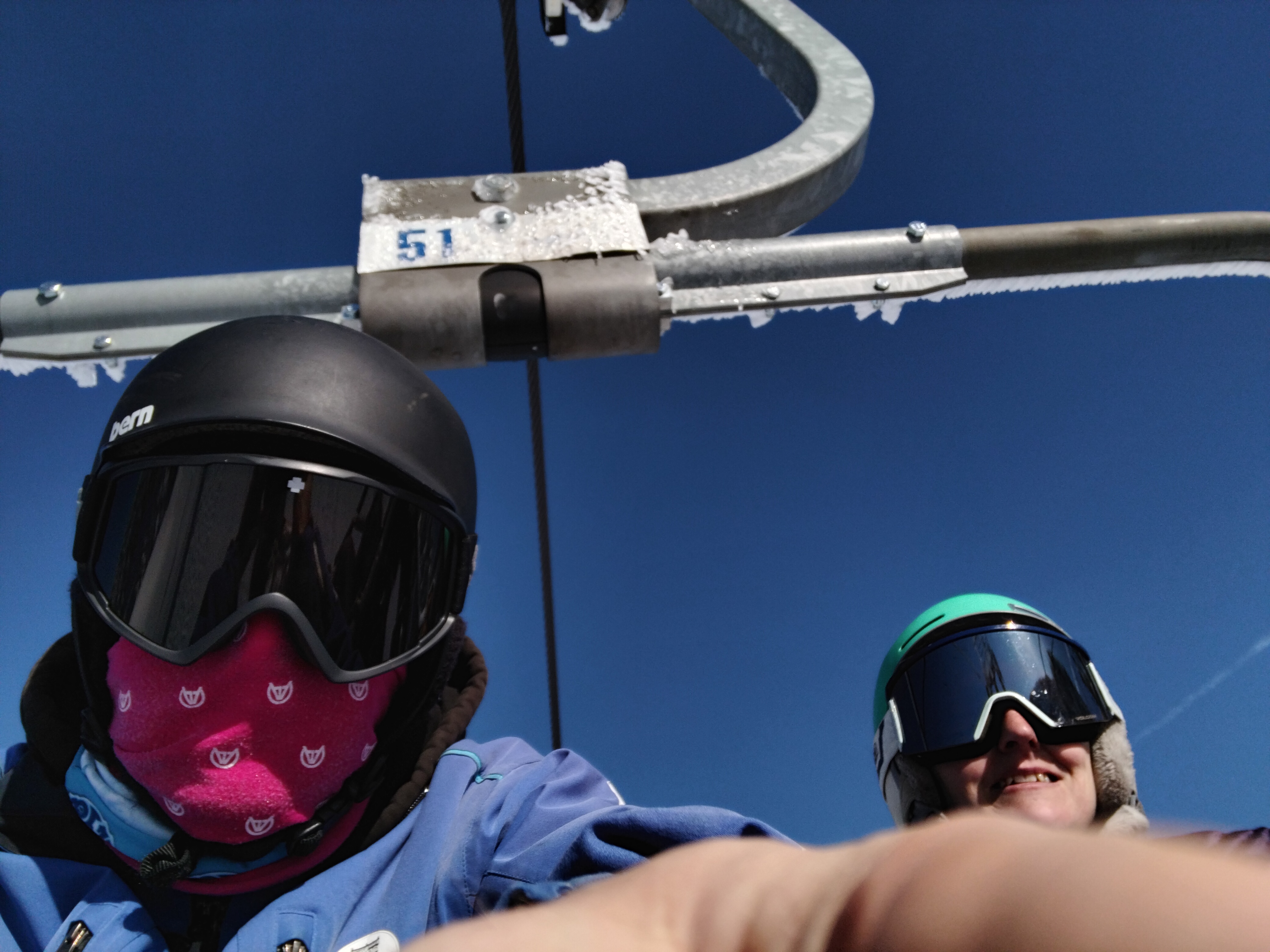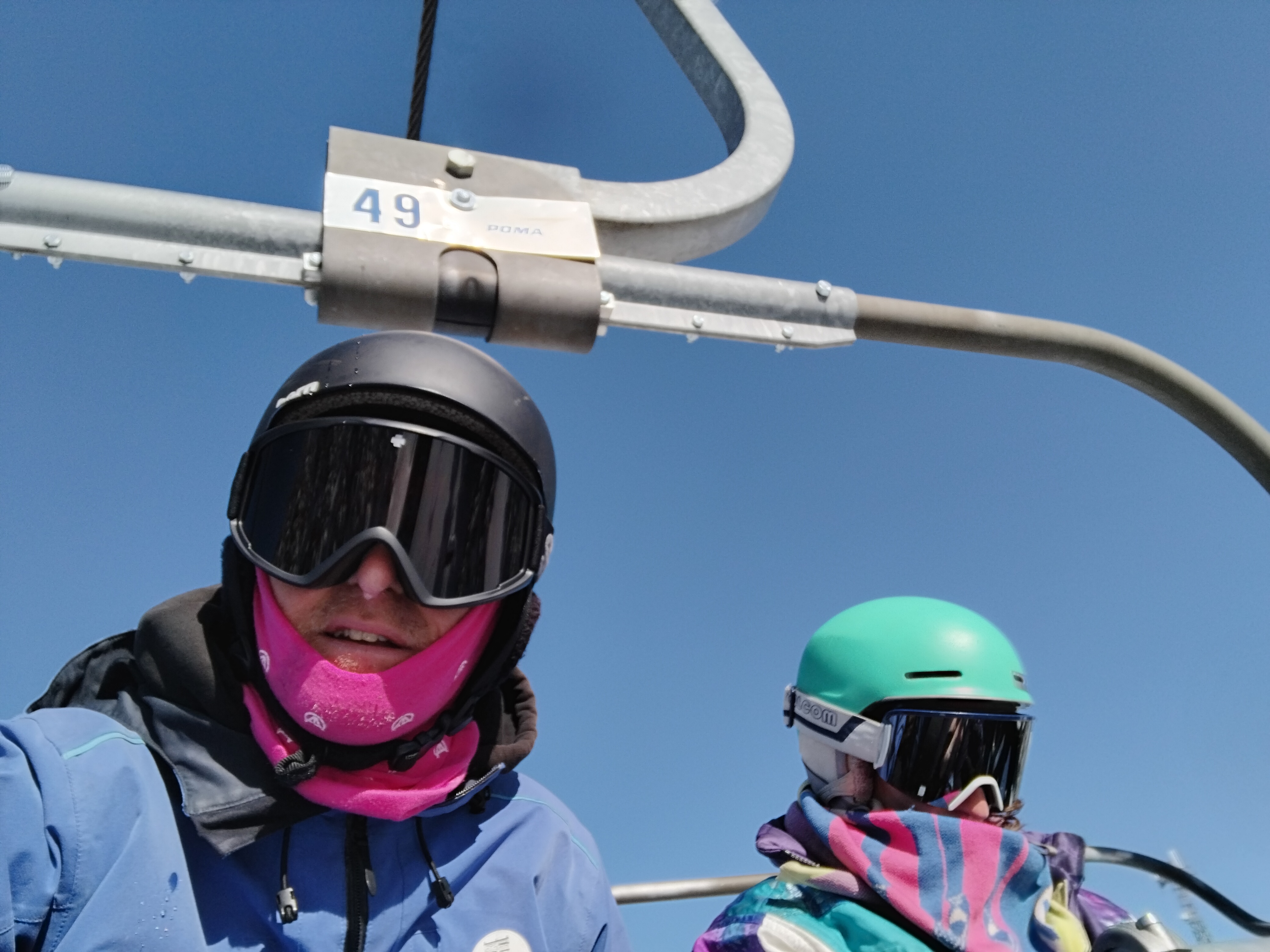 The first one! Yay! With Boí on chairlift 83, a bright and sunny day. You can only see the top of Boí’s helmet. Hopefully, I’ll get better at selfies on a chairlift and not drop the phone in the process.