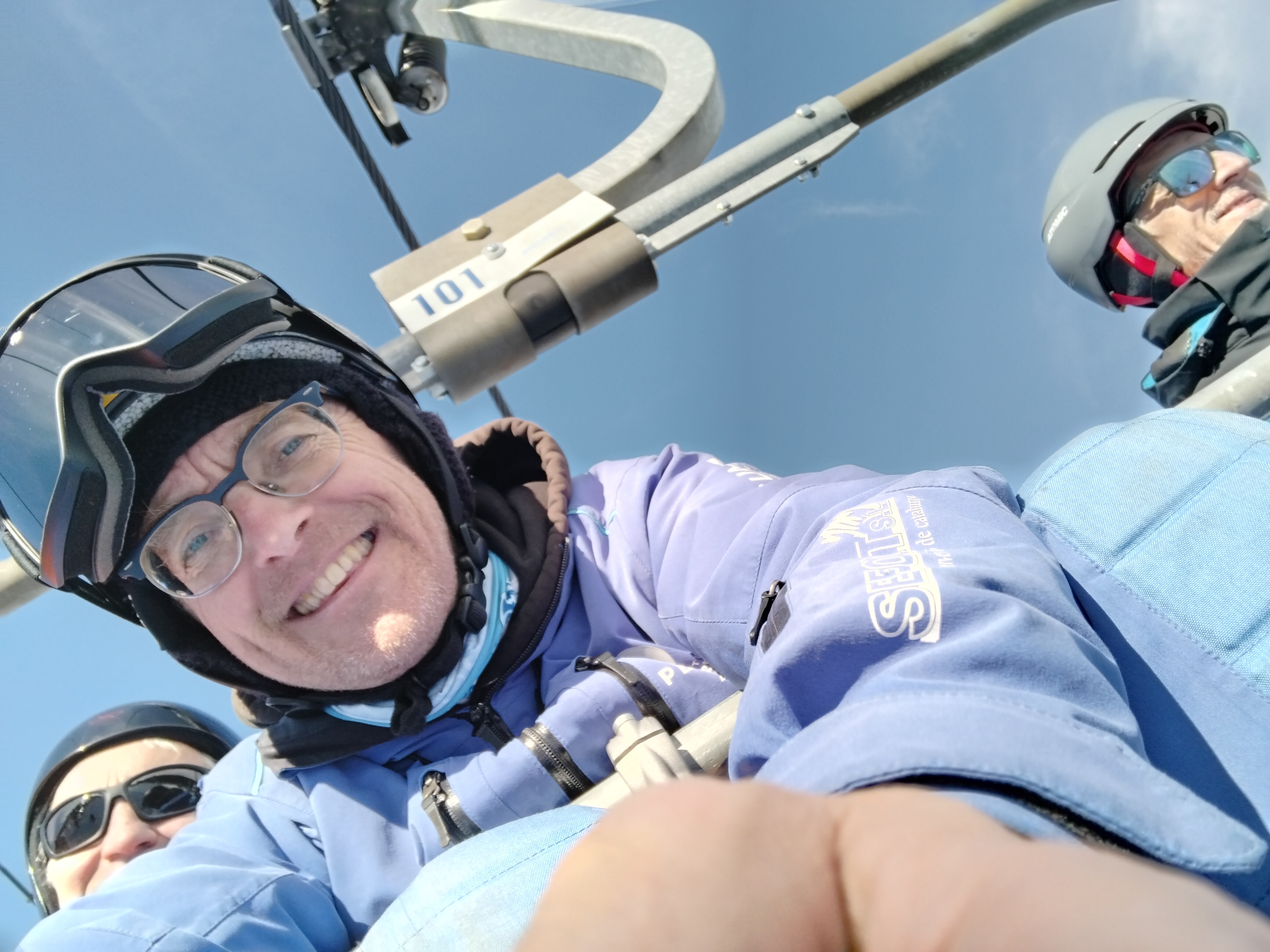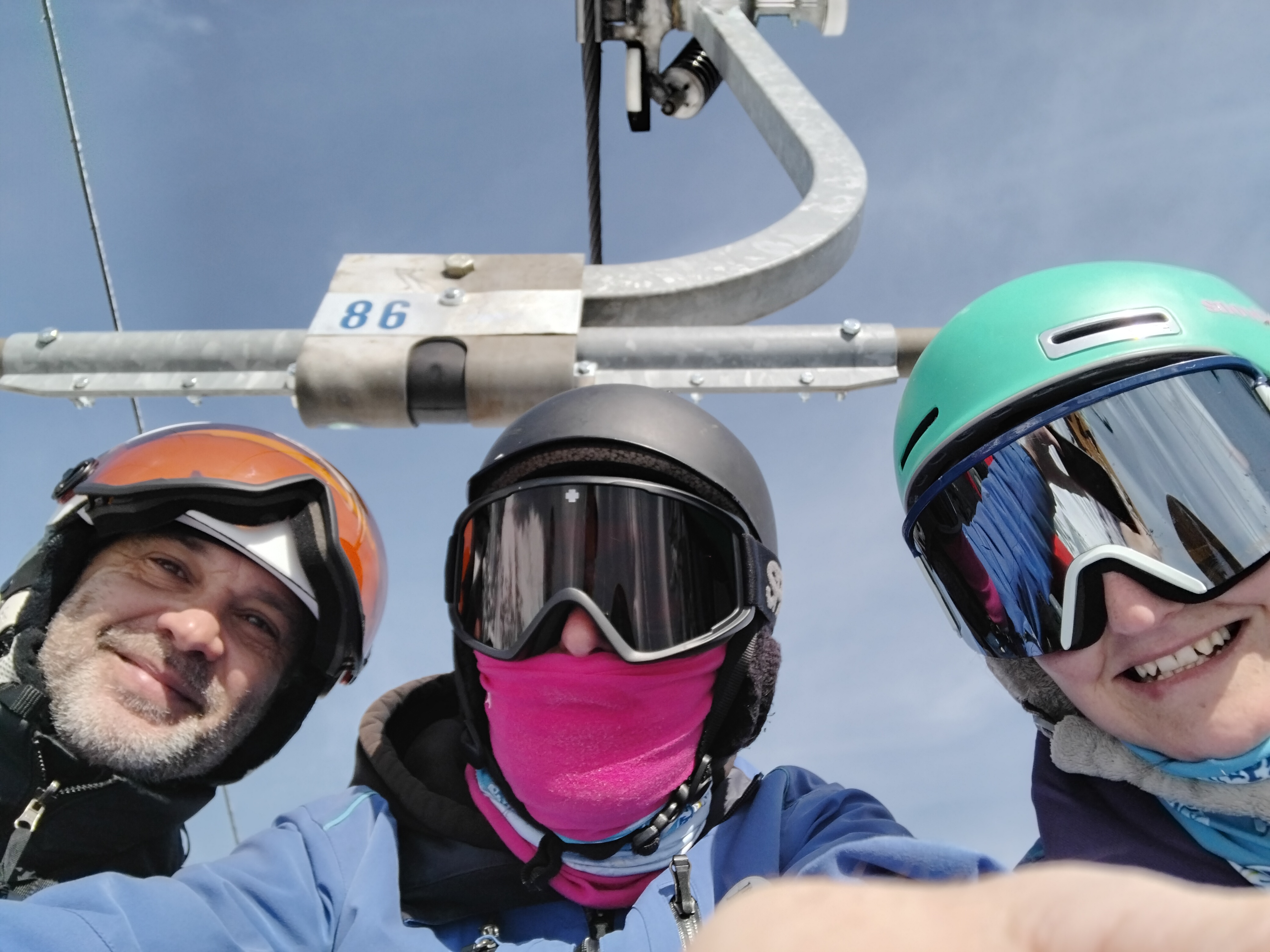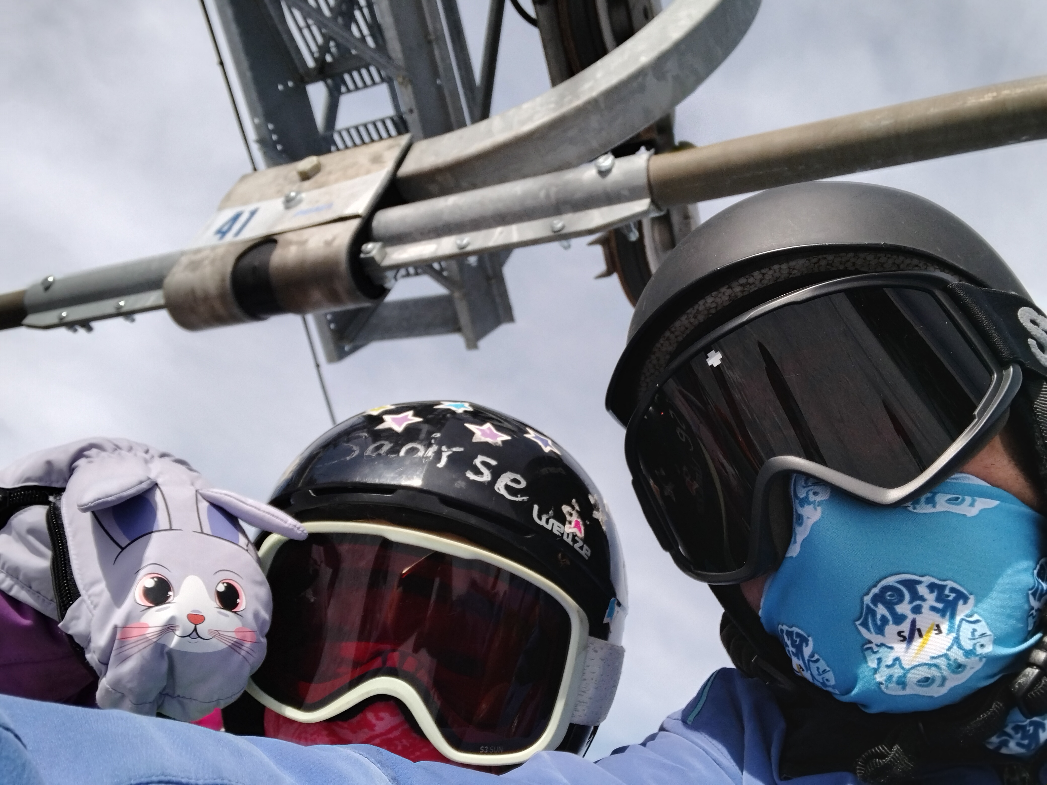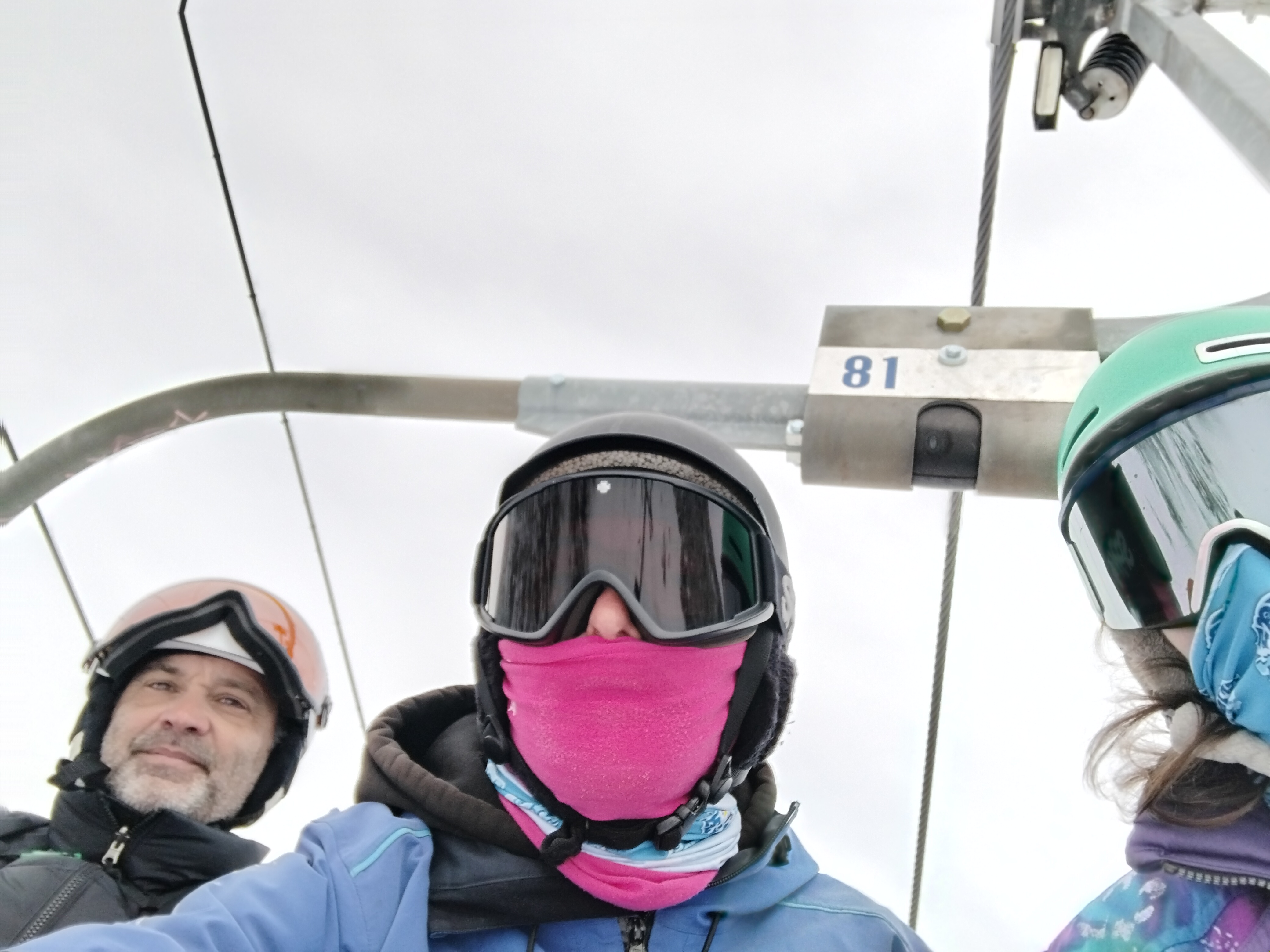 The first one! Yay! With Boí on chairlift 83, a bright and sunny day. You can only see the top of Boí’s helmet. Hopefully, I’ll get better at selfies on a chairlift and not drop the phone in the process.