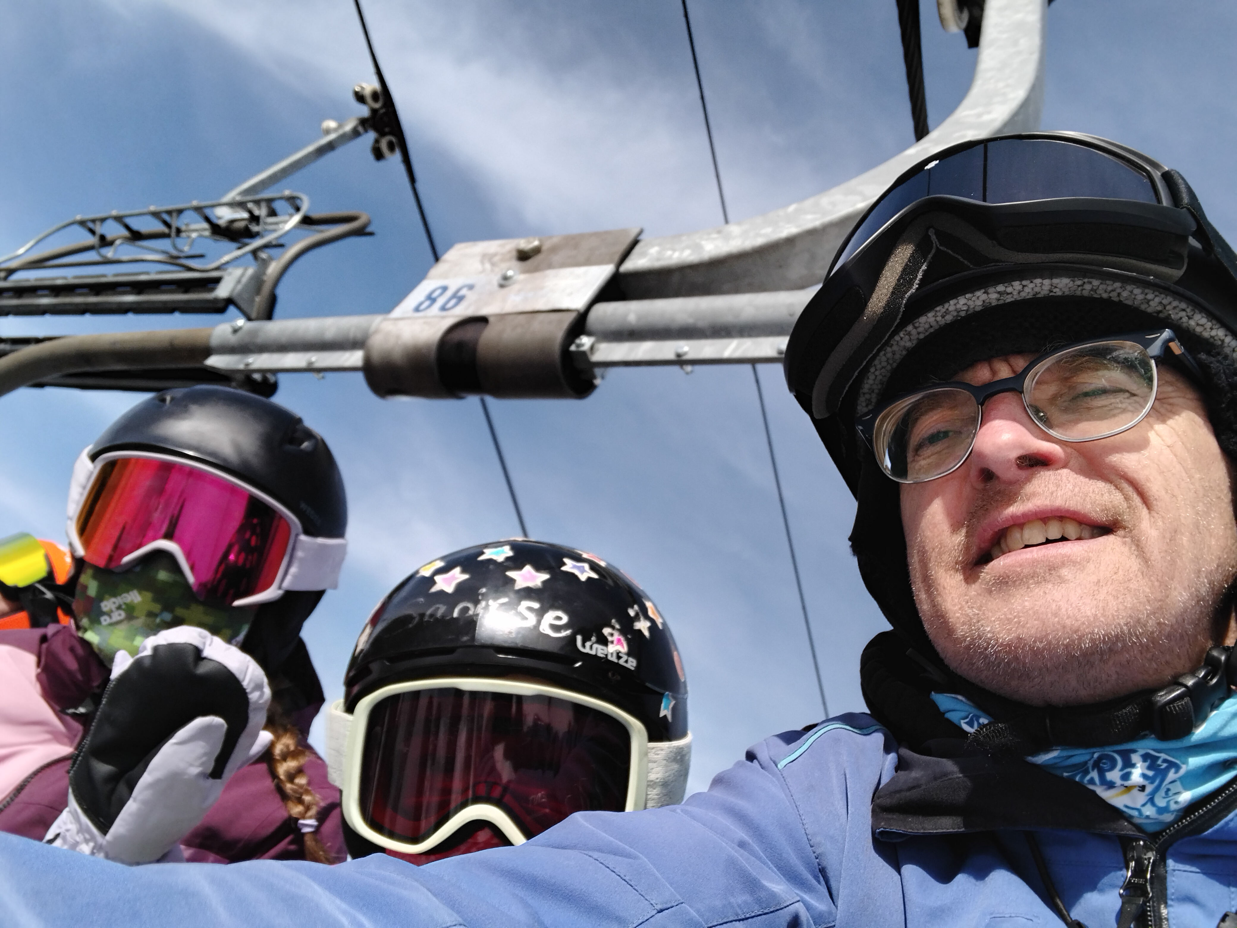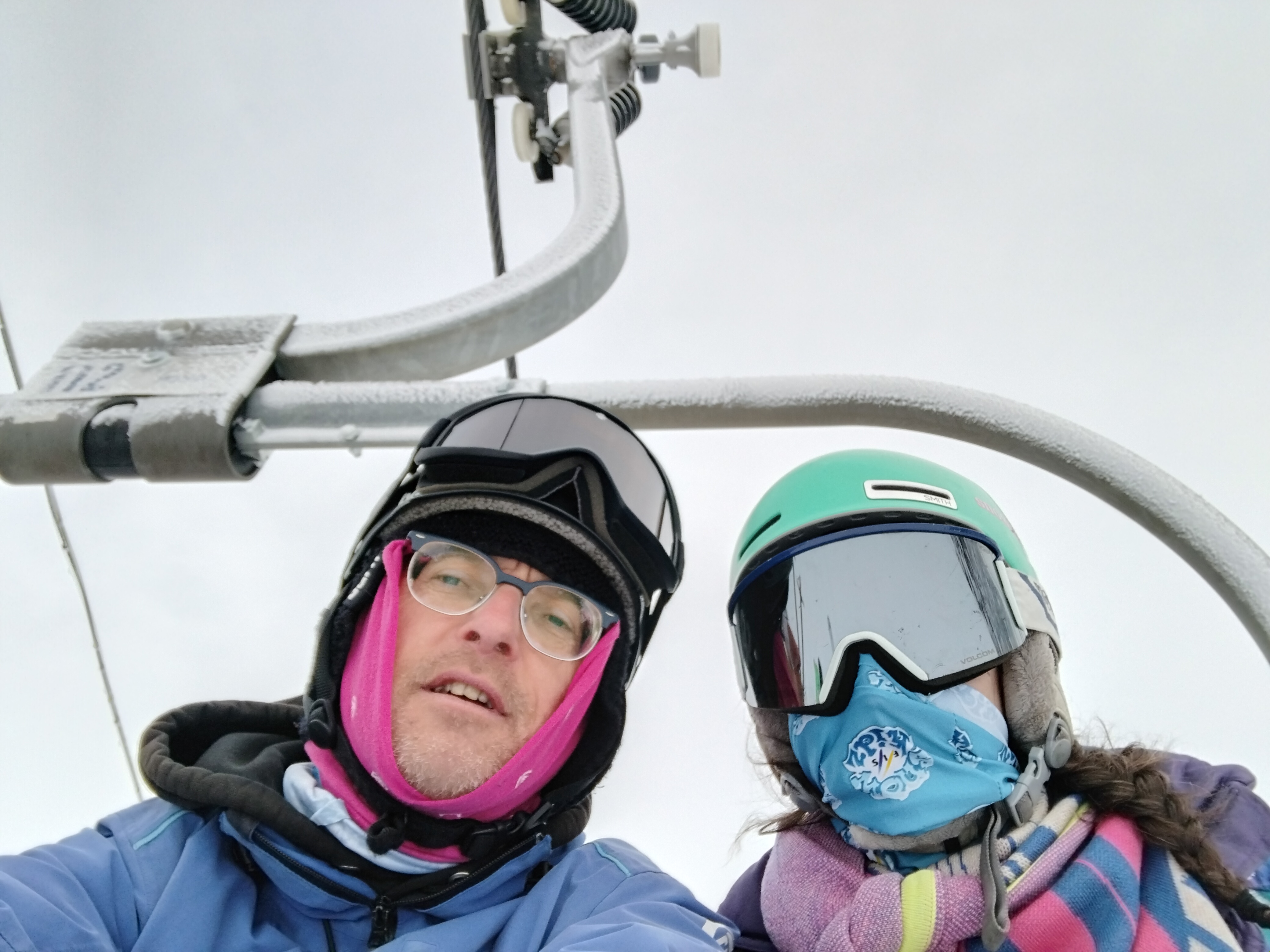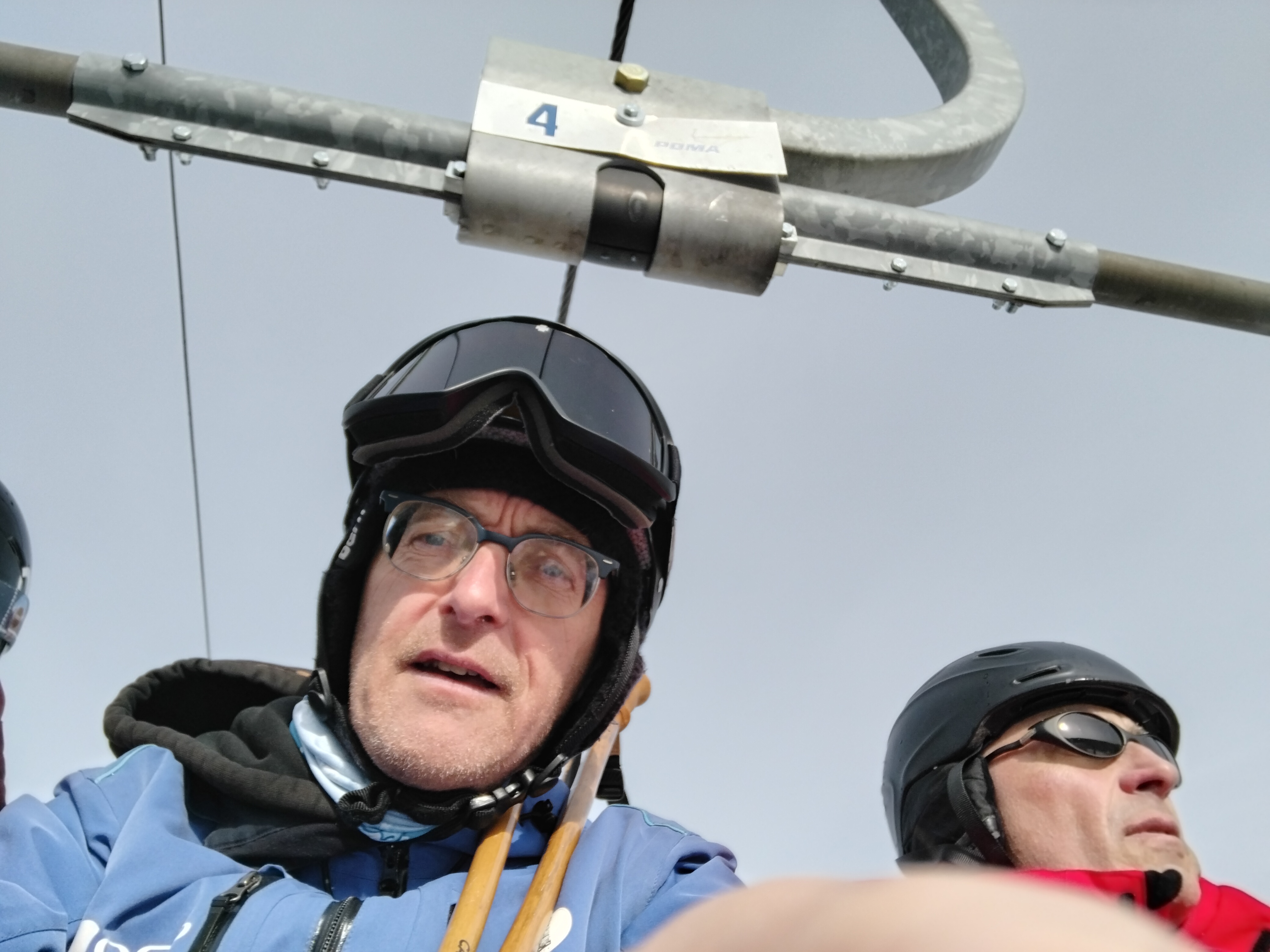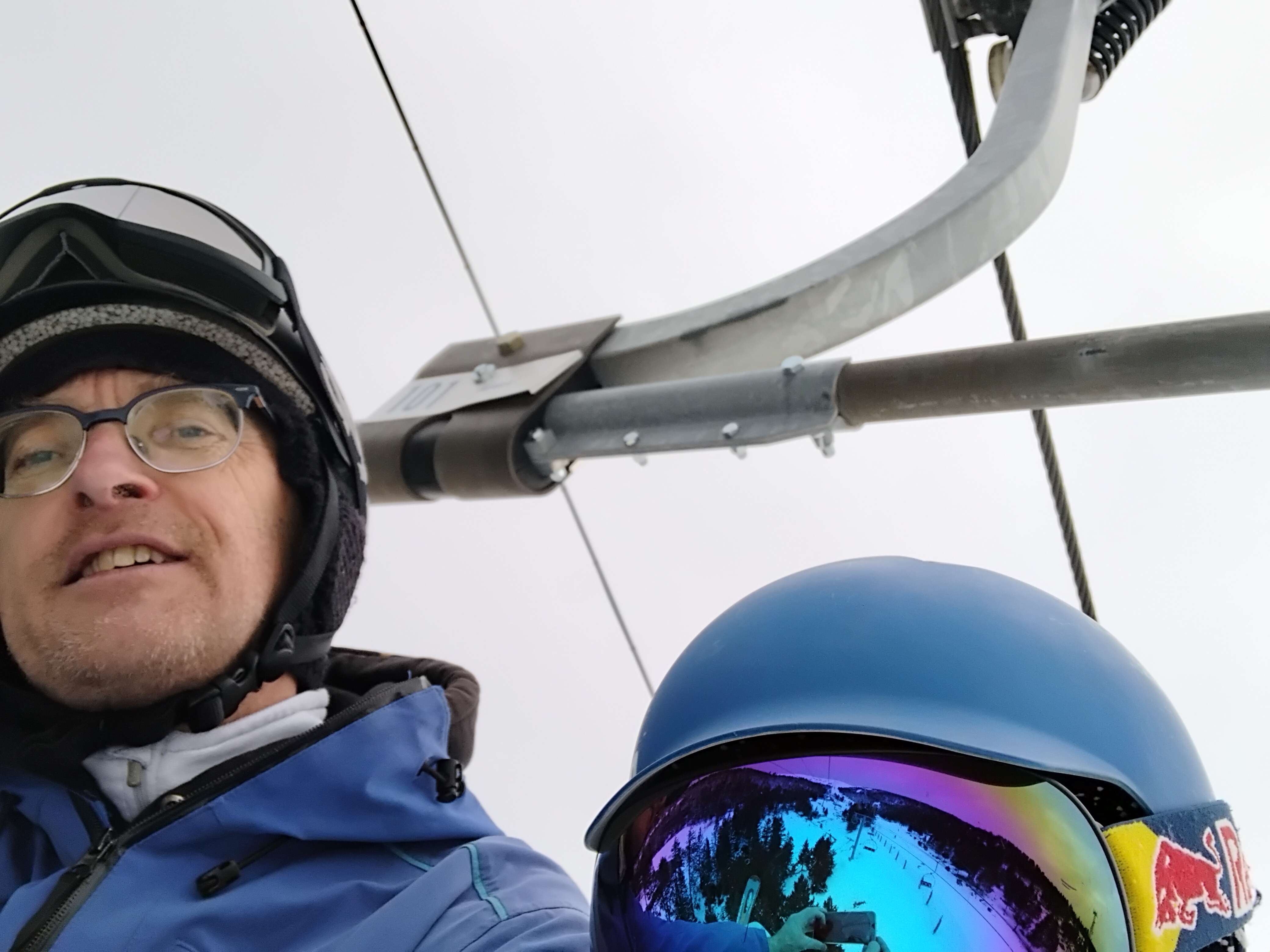 The first one! Yay! With Boí on chairlift 83, a bright and sunny day. You can only see the top of Boí’s helmet. Hopefully, I’ll get better at selfies on a chairlift and not drop the phone in the process.