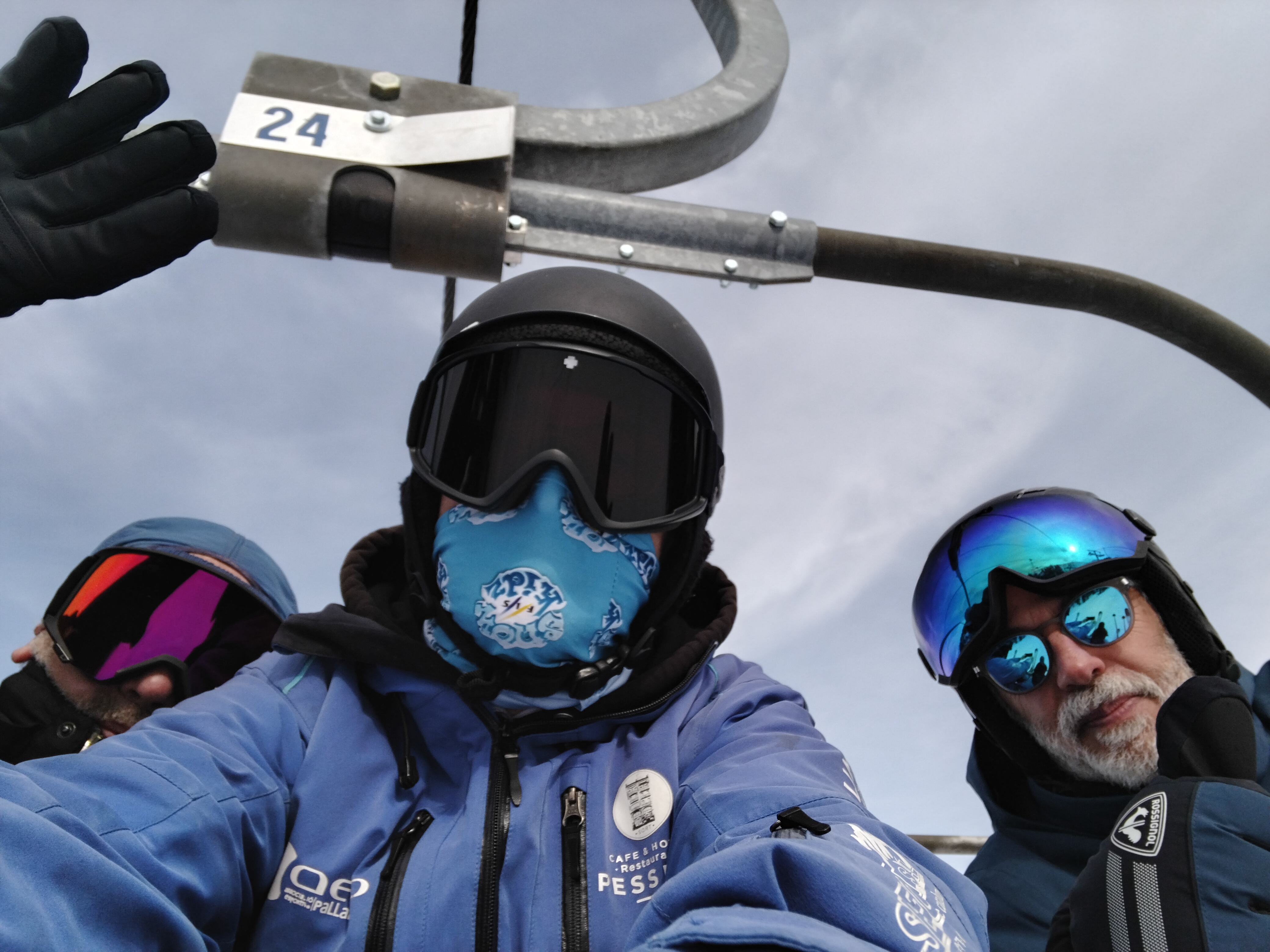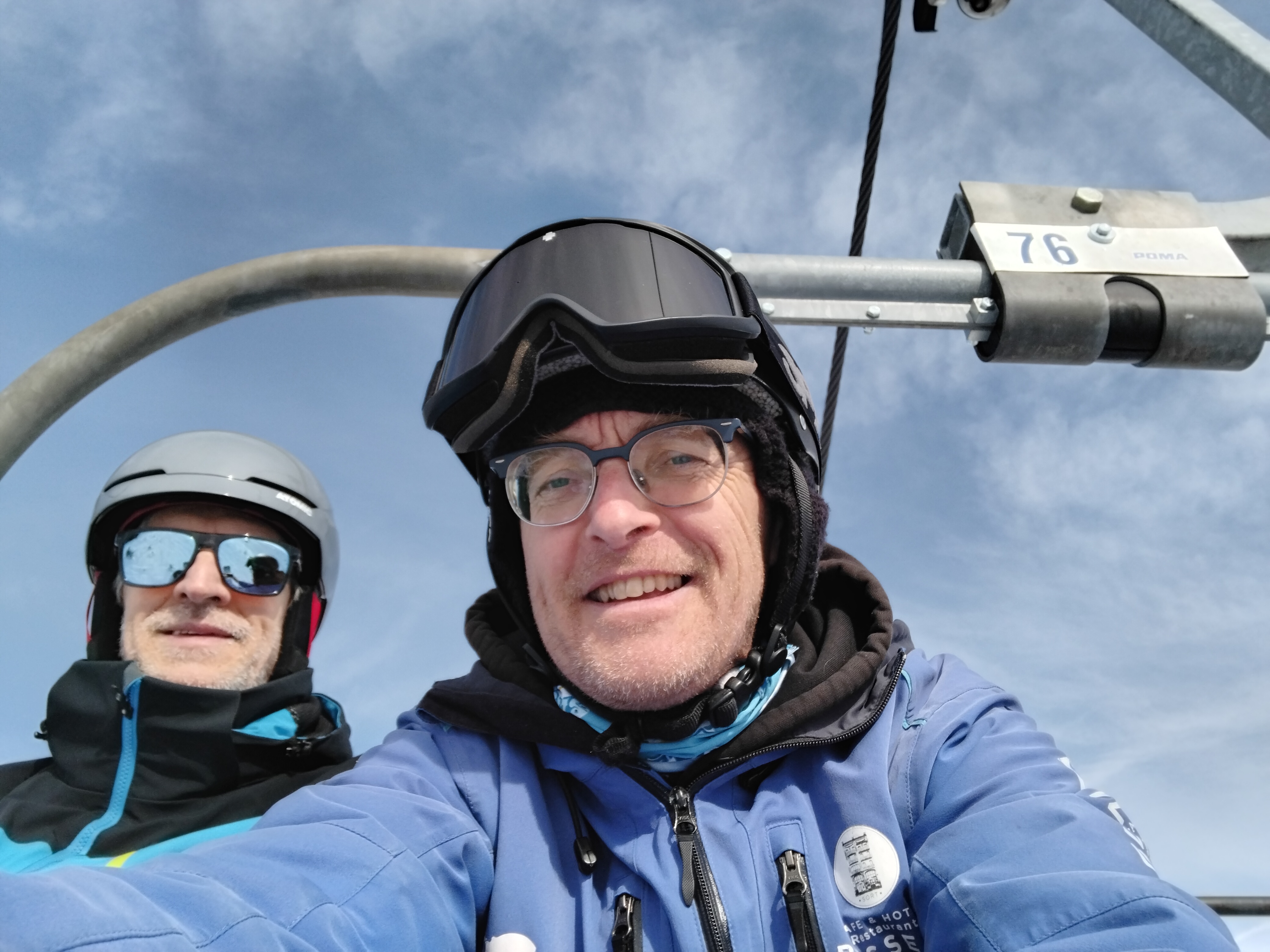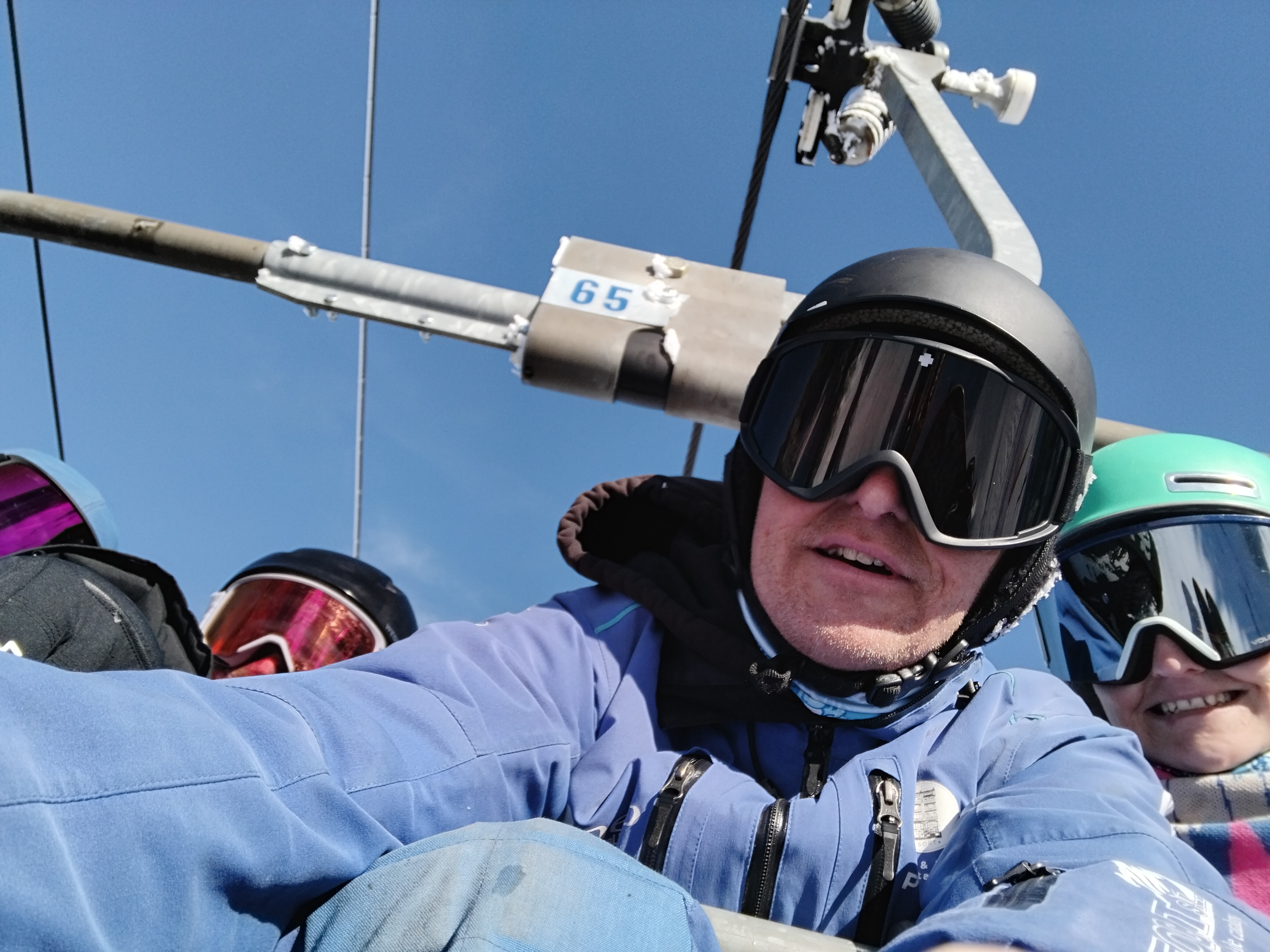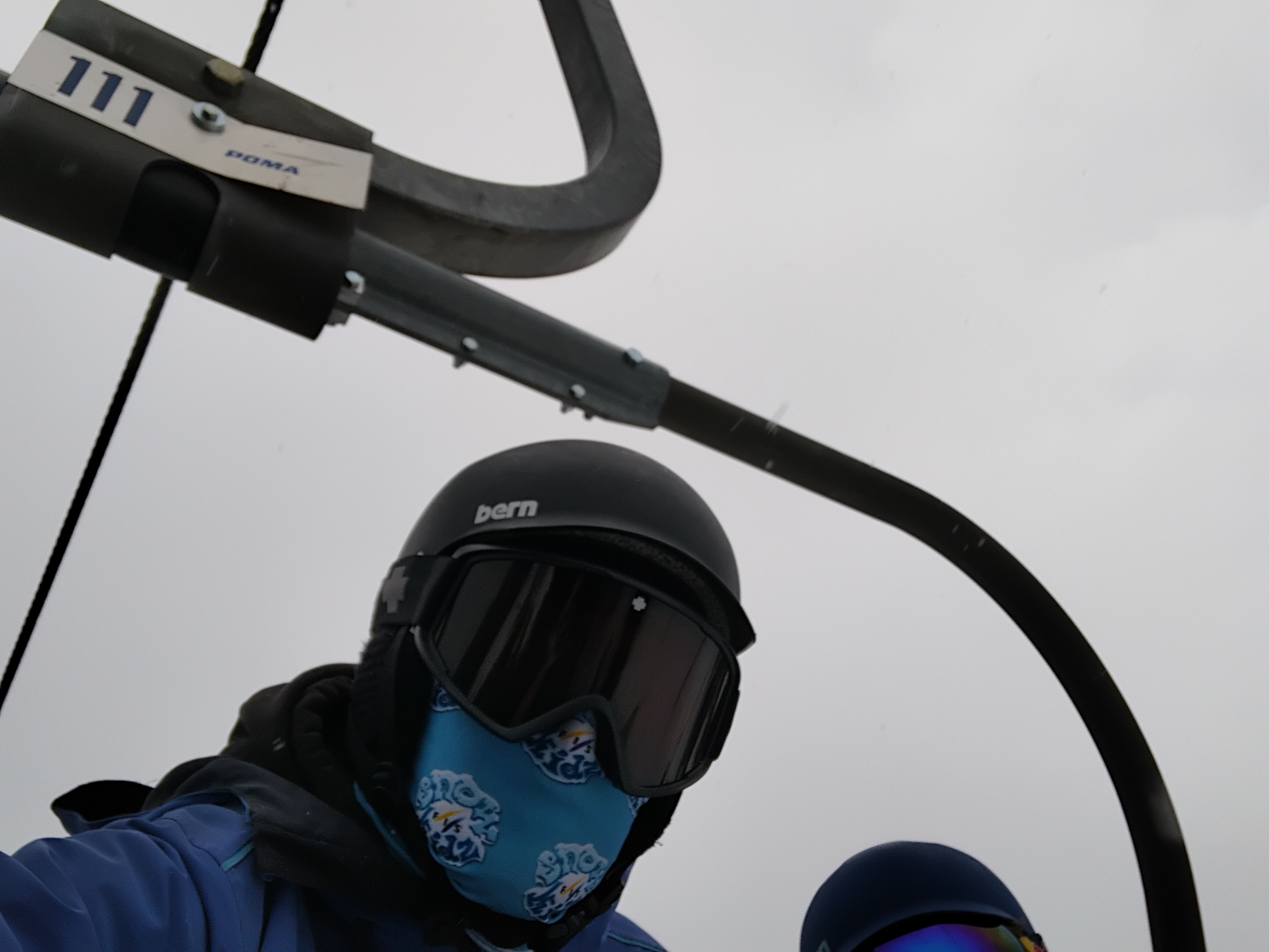The first one! Yay! With Boí on chairlift 83, a bright and sunny day. You can only see the top of Boí’s helmet. Hopefully, I’ll get better at selfies on a chairlift and not drop the phone in the process.