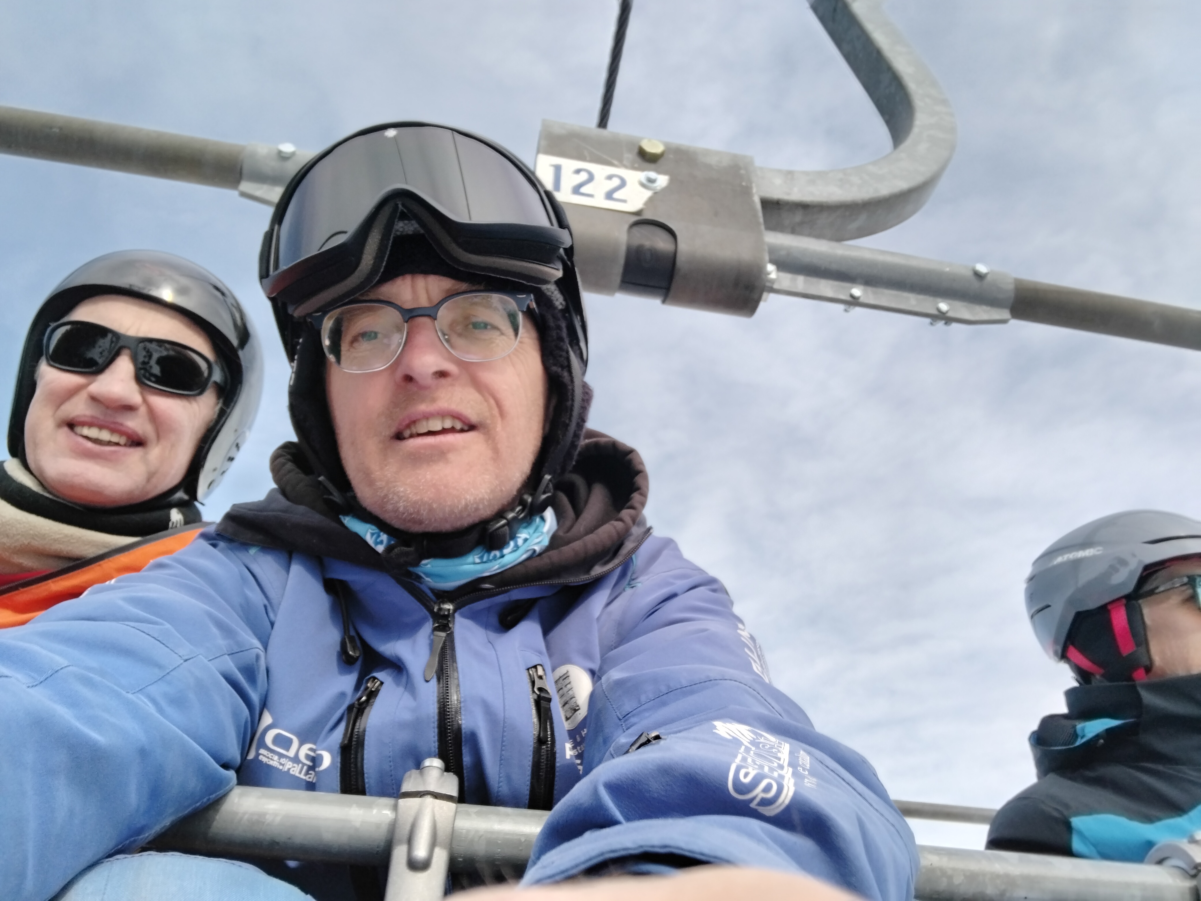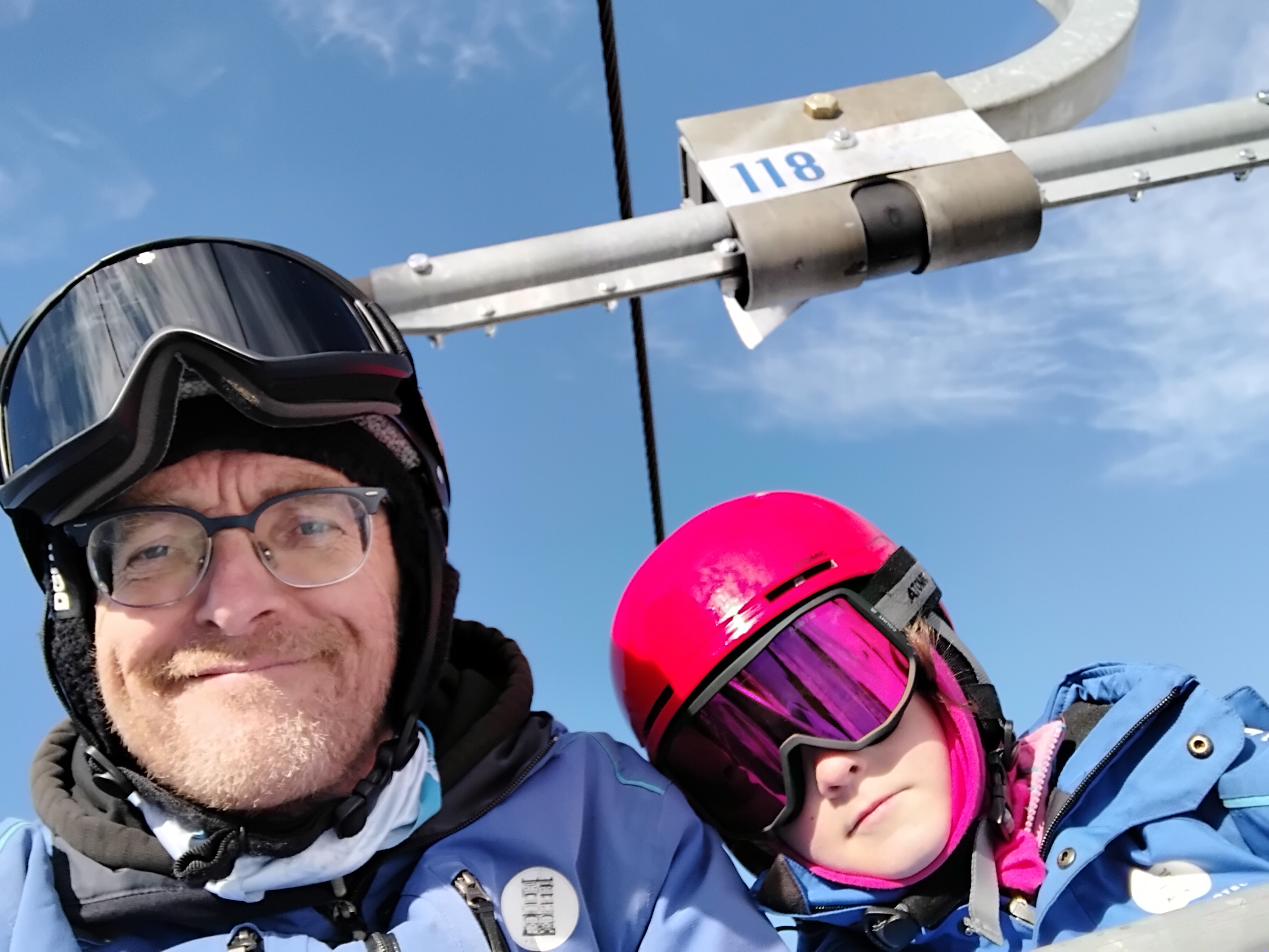 Papa and Pau on the second chairlift of the season. In 2024 this was the first chairlift of the season. Still waiting for the halfway point of the project.